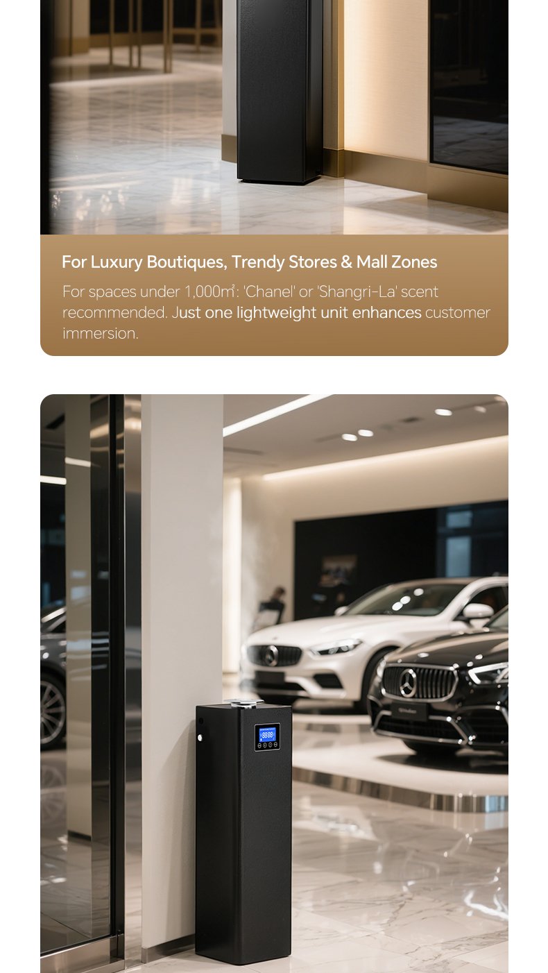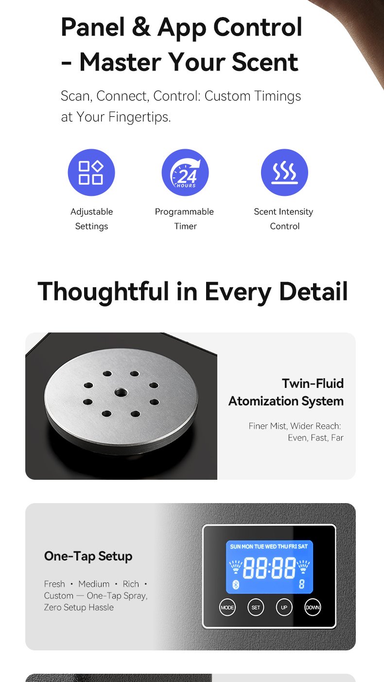 Twin-Fluid Atomization: Delivers an ultra-fine, consistent, and even fragrance mist.